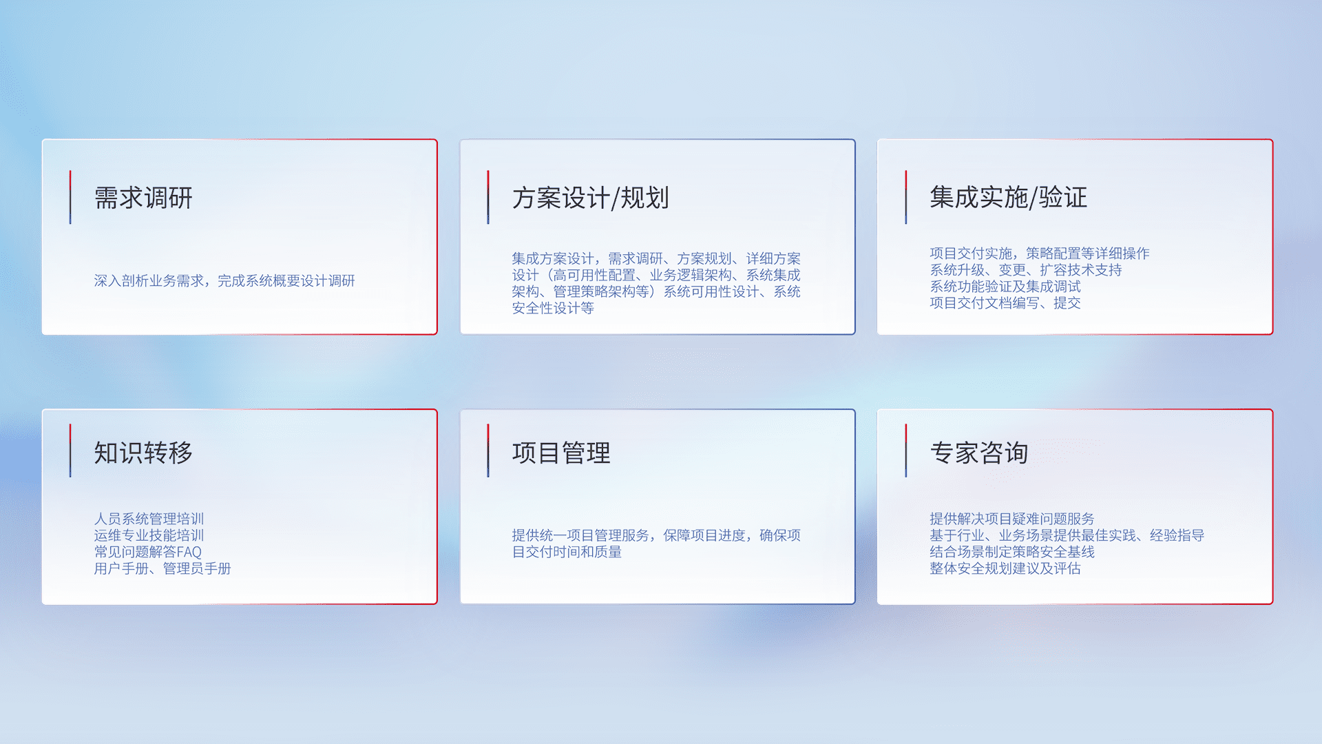 针对客户行业特性,,,将宏观的安全战略和需求,,,,通过专业的交付服务,,,,实现项目落地,,为客户提供标准规范的集成交付服务。。。。